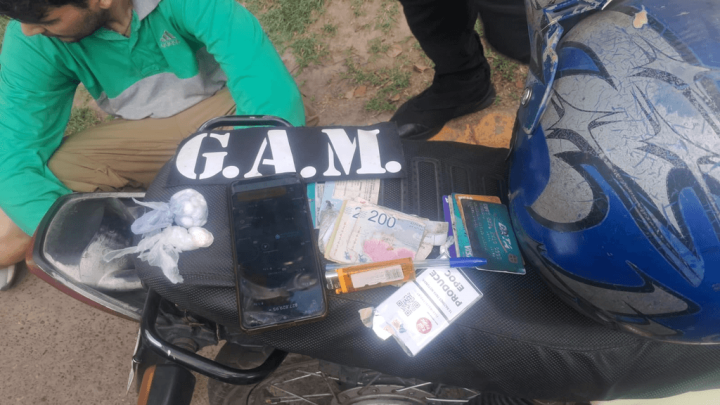 Los agentes interceptaron a los sospechosos que se trasladaban a bordo de una moto marca Motomel. Al intentar entrevistarlos, uno de ellos intentó darse a la fuga, pero fue perseguido y aprehendido a pocos metros.