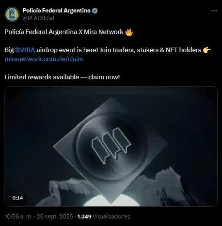La mañana de este viernes sorprendió a miles de usuarios de X cuando la cuenta oficial de la Policía Federal Argentina comenzó a publicar mensajes promocionando una criptomoneda llamada “$MIRA”. A las publicaciones se sumaron videos en los que se hablaba de una supuesta colaboración entre la fuerza y la empresa “Mira Network”.