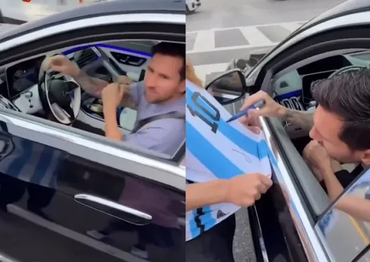 Con una sonrisa y total disposición, el astro argentino bajó la ventanilla, saludó a los hinchas y les firmó sus camisetas. Uno de ellos llevaba la camiseta de Inter Miami, su actual club, y el otro la de la Selección Argentina, en un momento que no tardó en viralizarse en redes sociales.