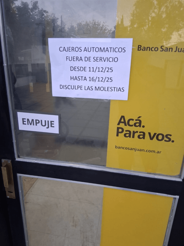 Los cajeros de Valle Fértil quedaron fuera de servicio por mantenimientoLos cajeros de Valle Fértil quedaron fuera de servicio por mantenimiento