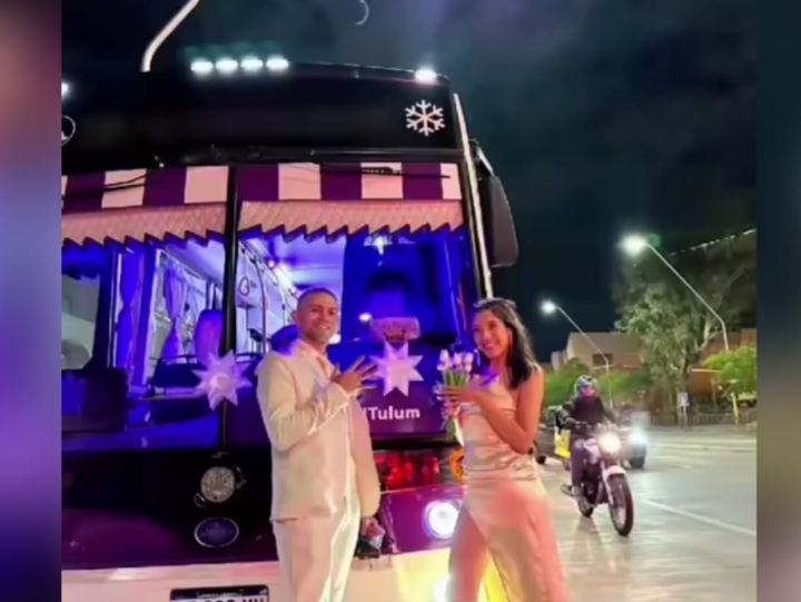 Lejos de optar por autos clásicos, limusinas o vehículos antiguos, los recién casados quisieron darle un toque personal y divertido al inicio de la celebración. El gesto estuvo directamente relacionado con la historia de ambos, ya que el novio es chofer de colectivos, lo que dio sentido a la elección del transporte.