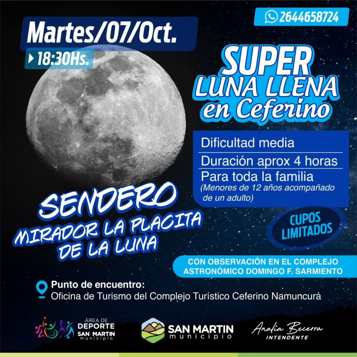 Además, los participantes podrán realizar una observación astronómica en el Complejo Domingo Faustino Sarmiento, donde se ofrecerán detalles sobre el fenómeno de la Súper Luna y las características del cielo sanjuanino.