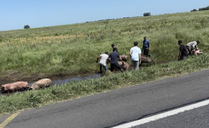 Un accidente insólito y caótico tuvo lugar en el kilómetro 179 de la Ruta Nacional 7, a la altura de Ingeniero Silveyra, partido de Chacabuco, en Buenos Aires, cuando un camión jaula que transportaba cerdos volcó y generó un descontrol inmediato.