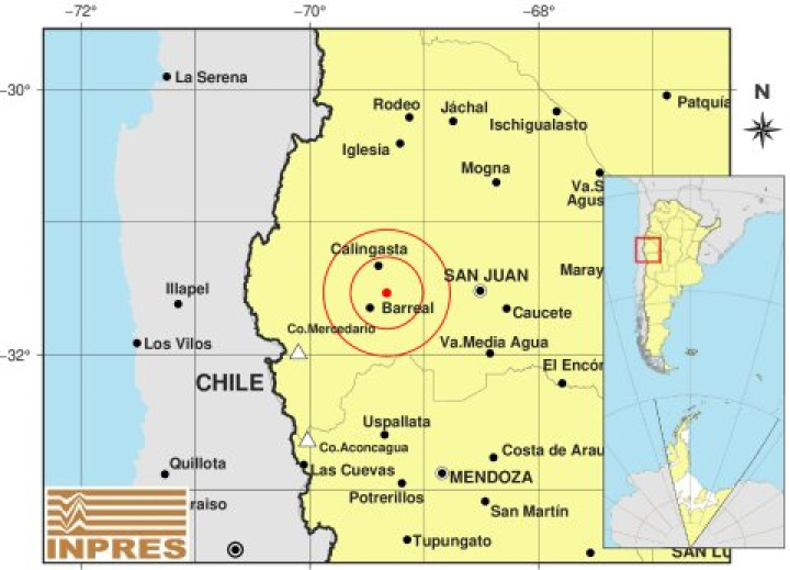 El epicentro fue localizado a 24 kilómetros al sur de Calingasta, 29 kilómetros al noreste de Barreal y 76 kilómetros al oeste de la ciudad de San Juan, a una profundidad de 117 kilómetros.
