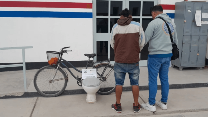 En las últimas horas, un insólito hecho sorprendió a los vecinos de Jáchal. Efectivos policiales que patrullaban por Avenida Santiago Funes observaron a un hombre en bicicleta transportando un inodoro de porcelanato blanco, marca Ferrum.