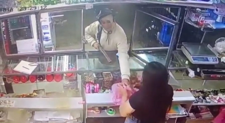 Puntualmente, ocurrió en inmediaciones de calle El Paisano, antes de Avenida Los Pinos. Según muestran las imágenes, el delincuente arribó en motocicleta y se hizo pasar por un cliente más. La joven que atendía el negocio lo recibió con amabilidad, sin imaginar que segundos después viviría una situación de terror.