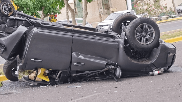 Una Toyota terminó patas arriba frente a una conocida panadería de Marquesado después de que su conductor perdiera el control y subiera al boulevard.