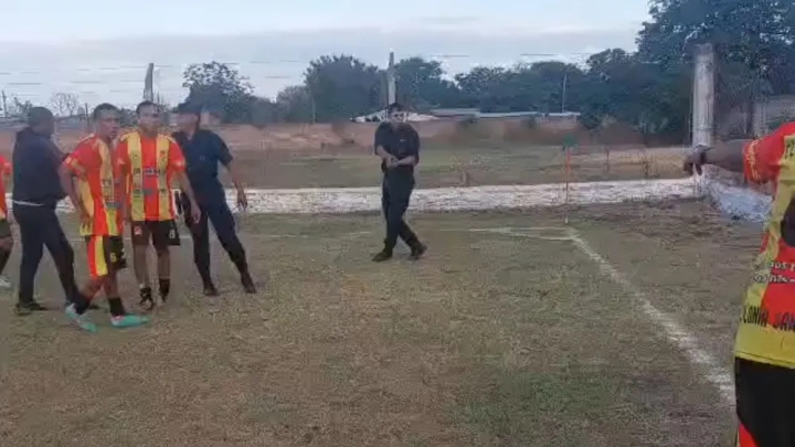 Un partido de fútbol amateur en Salta terminó en caos cuando un policía sacó su arma reglamentaria en medio de disturbios entre jugadores, hinchas y la terna arbitral.