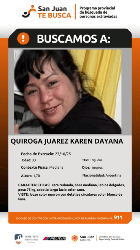 El Programa Provincial de Búsqueda de Personas Extravidas San Juan Te Busca, dependiente del Ministerio Público Fiscal y la Secretaría de Estado de Seguridad y Orden Público, solicita la colaboración de todos para encontrar a Karen Dayana Quiroga Juárez, de...