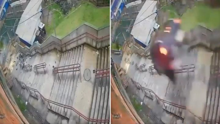 En un video que rápidamente se viralizó en redes sociales, se observa cómo el auto atraviesa la baranda, desciende por las escaleras, choca de frente contra el suelo y termina volcado.