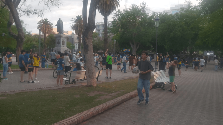 Con el paso de los minutos, más hinchas fueron llegando a la plaza, ya sea caminando, en bicicleta, en moto o en autos. Vestidos con los colores azul y amarillo, las familias se acercaron para acompañar la celebración, observadas por un operativo policial preparado para la ocasión.
