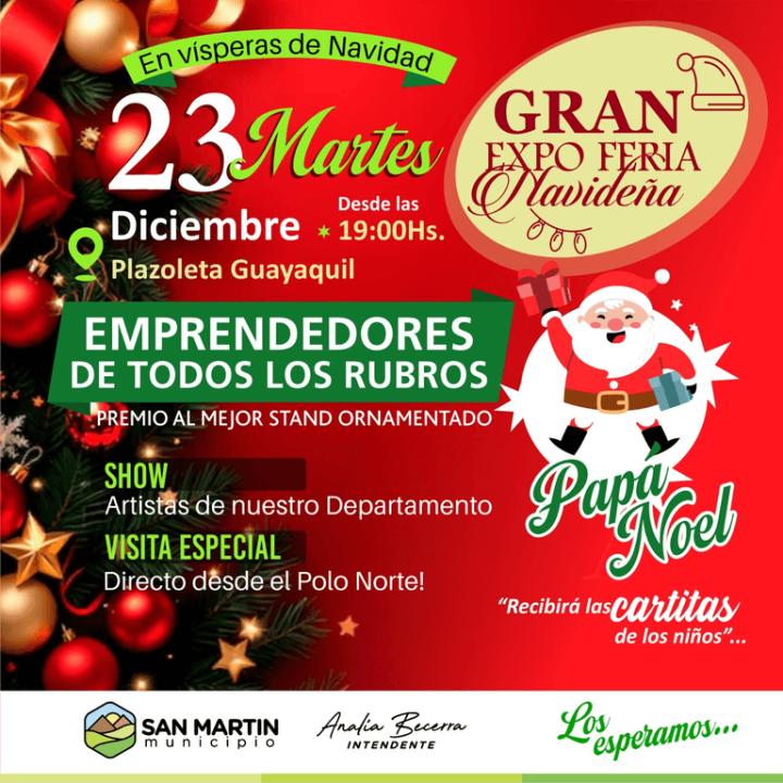 En vísperas de las fiestas, la Municipalidad de San Martín invita a la comunidad a participar de la Gran Expo Feria Navideña, que se realizará este martes 23 de diciembre, desde las 19 horas, en la Plazoleta Guayaquil.