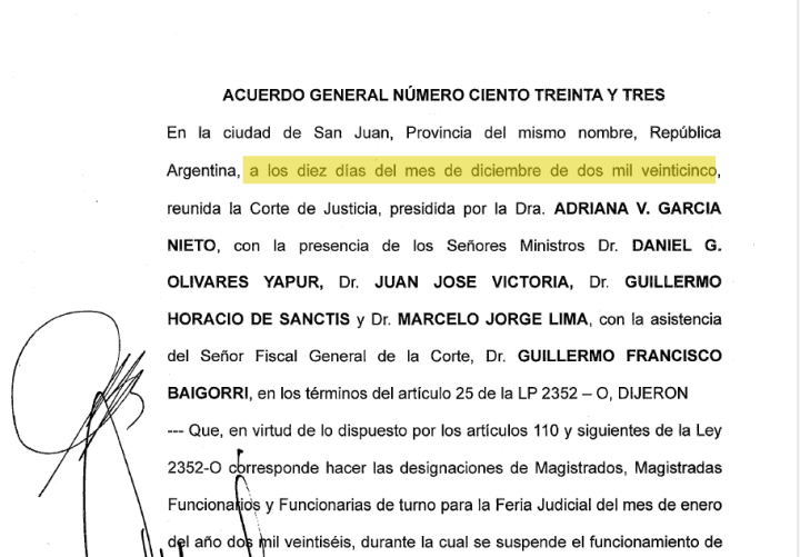 Ese medio tuvo acceso a la Acordada N.º 133, que regula el funcionamiento de la Feria Judicial de enero de 2026, y tiene fecha del 10 de diciembre de 2025. Ese dato contradice la versión brindada a Zonda Digital por Gustavo Martínez, desde la Dirección de Comunicación del Poder Judicial, quien afirmó que la decisión había sido tomada y comunicada con mucha anterioridad.